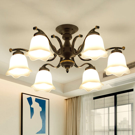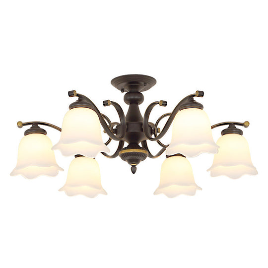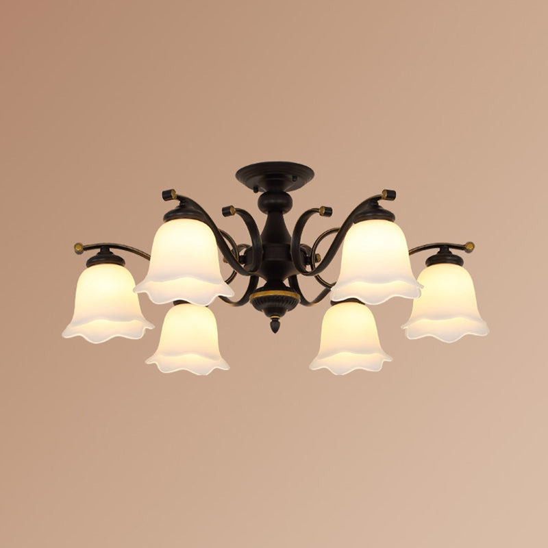 Vintage Frosted Glass Flower Shade Semi Flush Mount Chandelier For Bedroom Ceiling 6 / Black