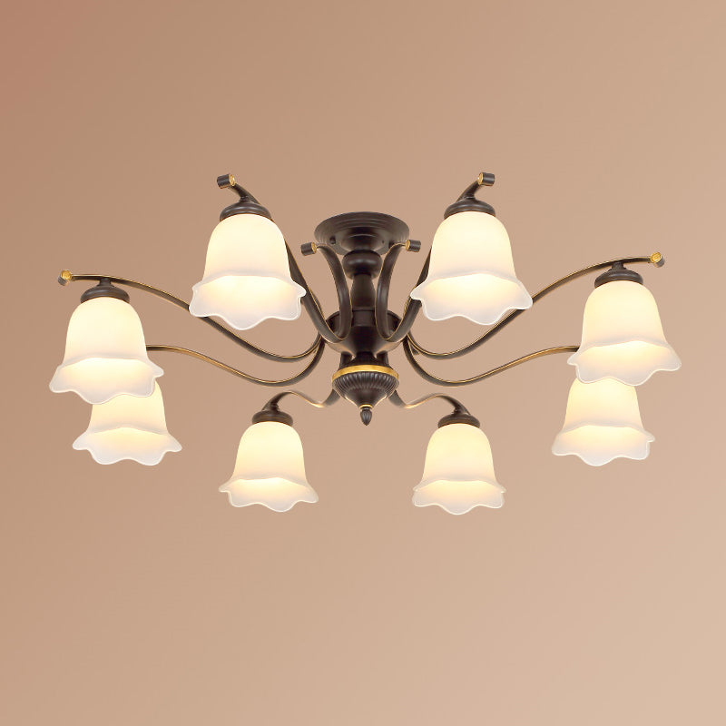 Vintage Frosted Glass Flower Shade Semi Flush Mount Chandelier For Bedroom Ceiling 8 / Black