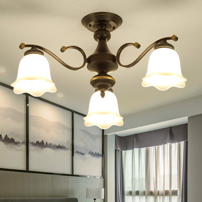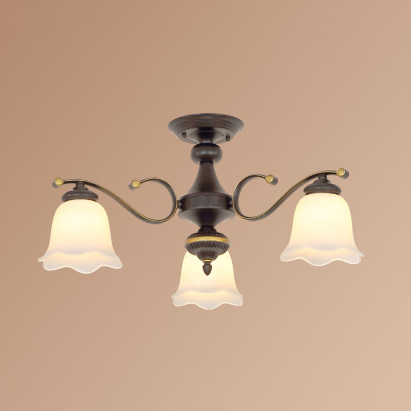 Vintage Frosted Glass Flower Shade Semi Flush Mount Chandelier For Bedroom Ceiling 3 / Black