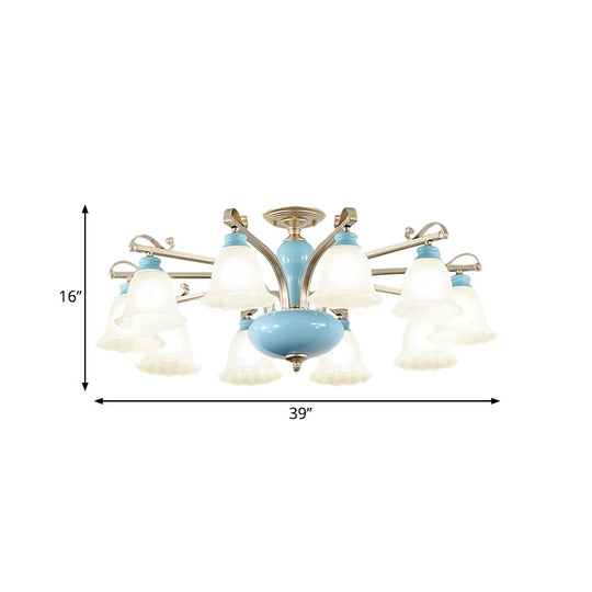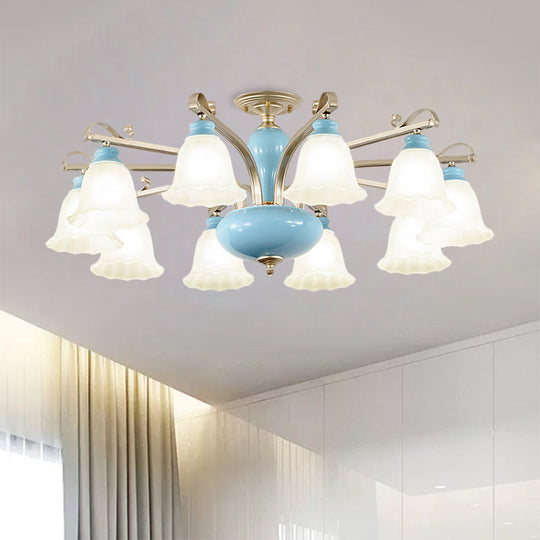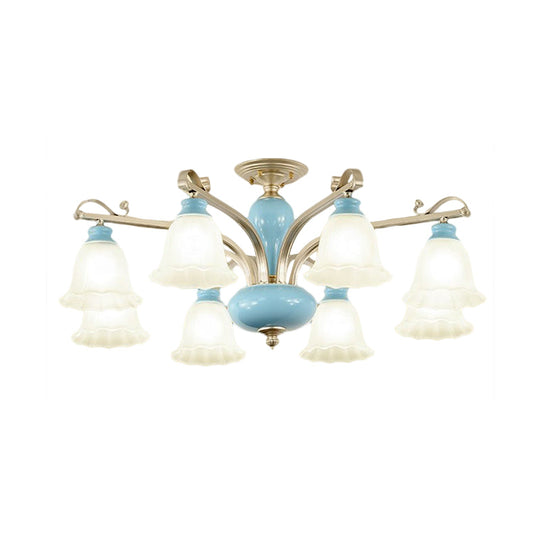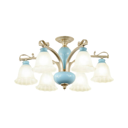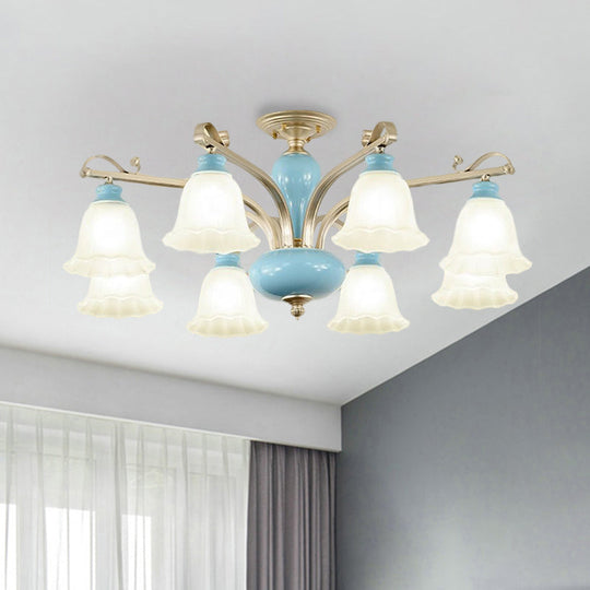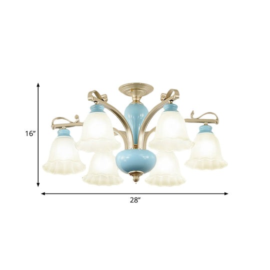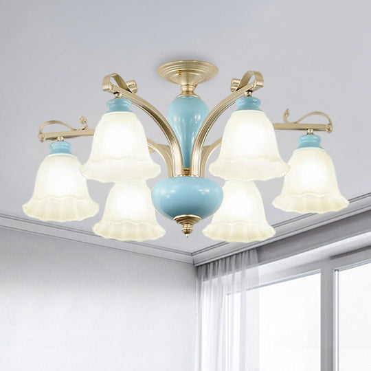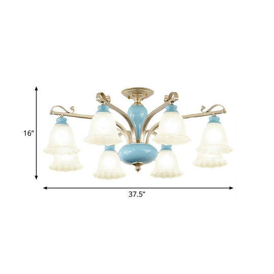 Rural Style Blue Chandelier with Cream Glass Blossom Shaped Pendant Light - 3/6/8 Bulbs