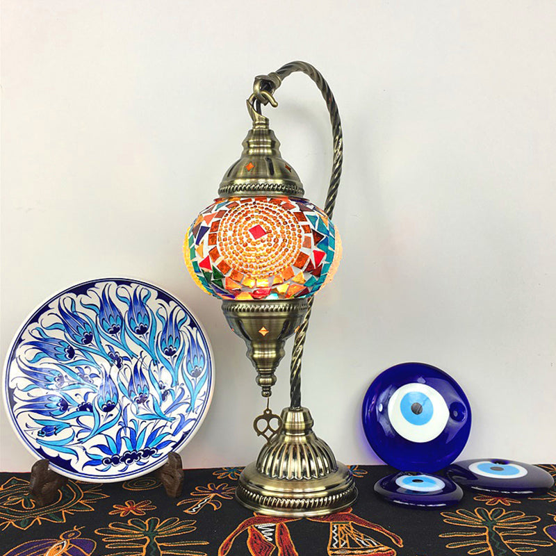Antique Brass Armed Task Lamp with Colorful Glass Shade – Single Bulb Table Light