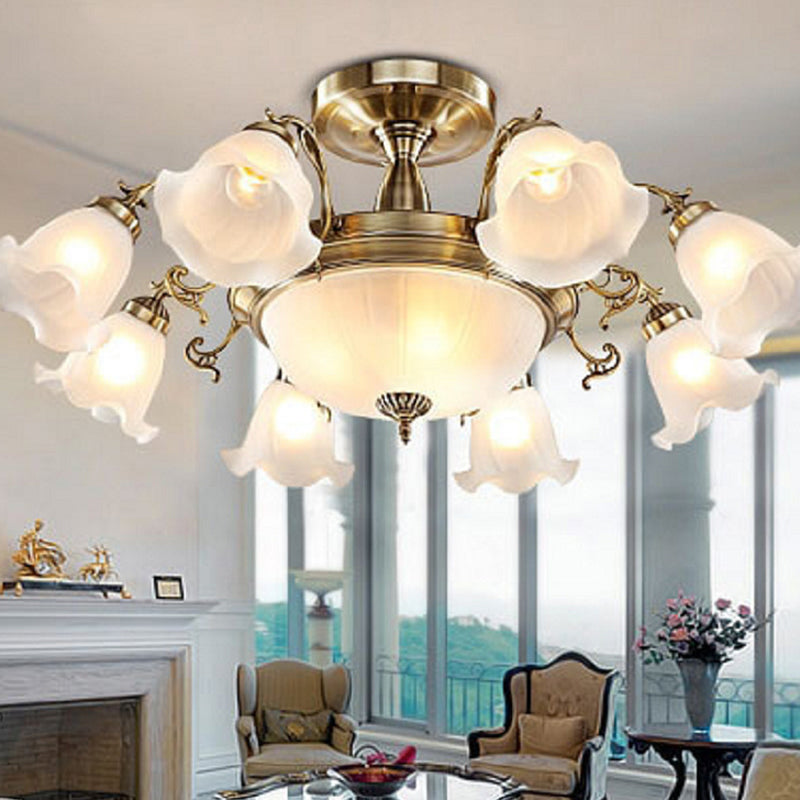 This is a beautiful semi-flush mount chandelier that is perfect for any room in your home. It features eight lights, a copper bronze finish, and a traditional style. The metal construction is durable and the opal frosted glass is eye-catching. The chandelier measures 27.5 inches wide by 15 inches tall and comes with a voltage of 220V-240V 110V-120V. The bulb base is E26/E27 and the light type is LED/Incandescent/Fluorescent.