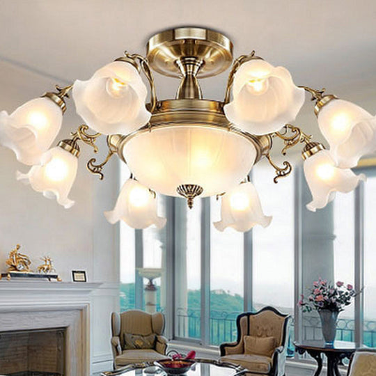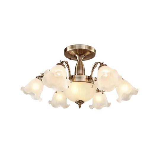Rustic Opal Frosted Glass Ruffled Ceiling Mount Chandelier - Bronze/Copper With 8 Bulbs