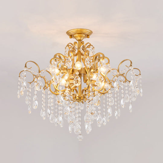 Brass Scrolled Arm Semi-Flush Light With Crystal Draping 8 /