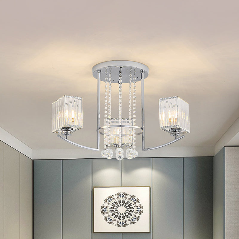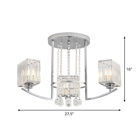 Cuboid Semi Flush Ceiling Lamp - Clear Crystal Chandelier With Strands Deco In Chrome 3 Lights