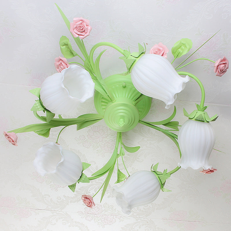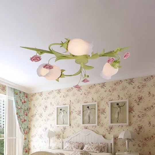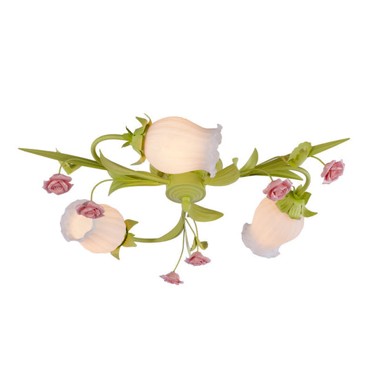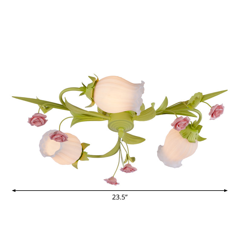 Frosted White Glass Ruffle Semi Flush Lamp - Green Pastoral Ceiling Light with 3 Lights for Bedroom