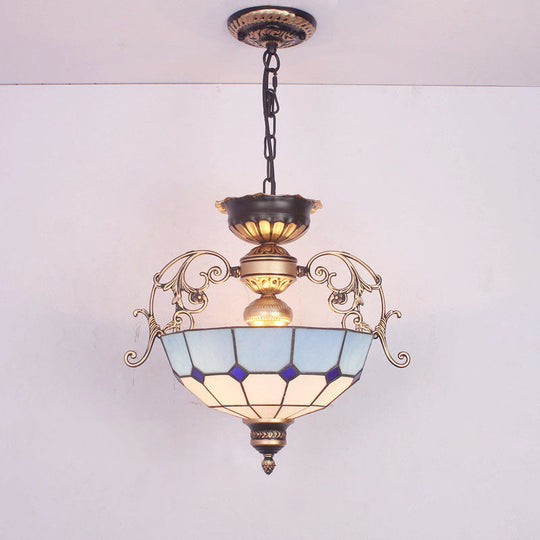 Grid Glass Pendant Chandelier Light With Inverted Dome Design - 3-Bulb Fixture For Entryway Blue