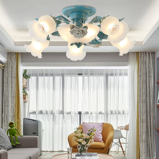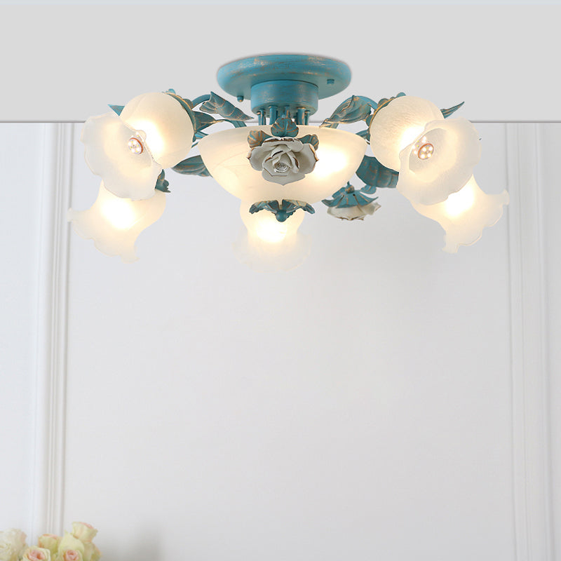Korean Garden Flower Ceiling Light For Bedroom With Frost Glass Semi-Flush Mount 7 / Blue