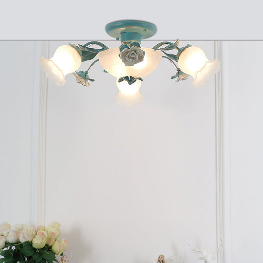 Korean Garden Flower Ceiling Light For Bedroom With Frost Glass Semi-Flush Mount 5 / Blue