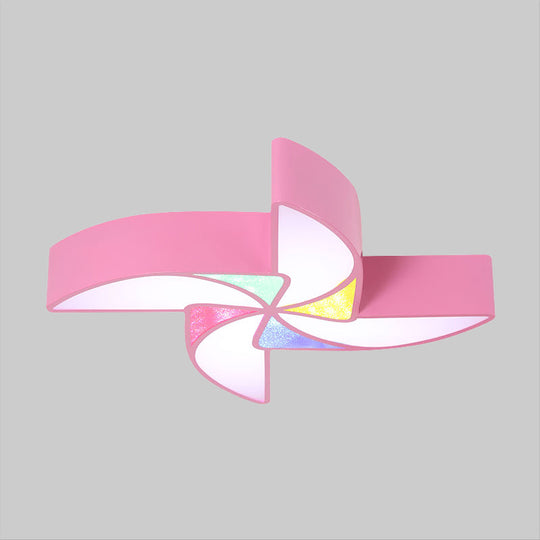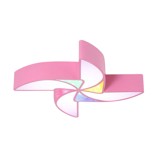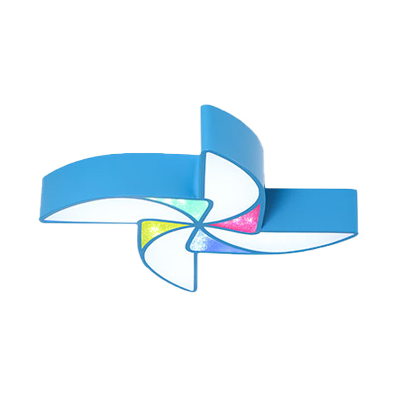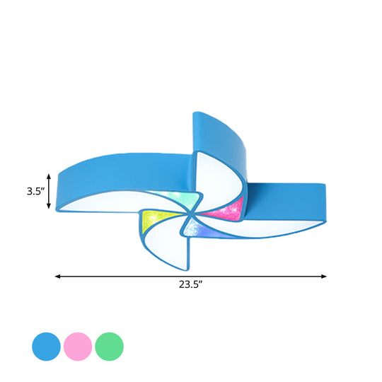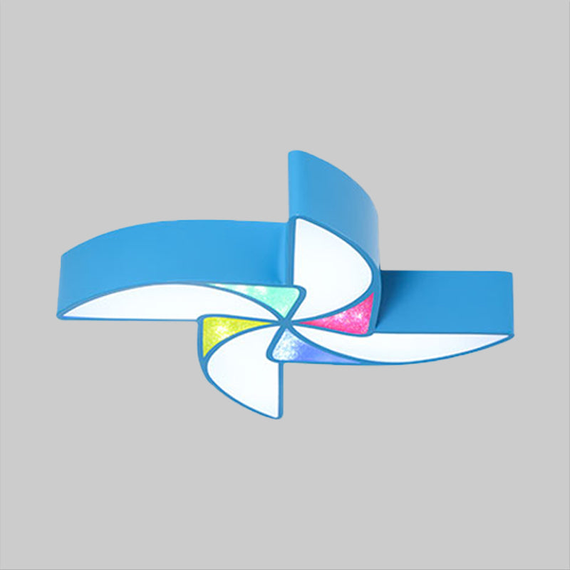 This product is an LED light fixtures in the category of ceiling lights. The LED light is modern in style with a blue, green, and pink color scheme. The acrylic shade is in the shape of a windmill. The fixture is designed to be mounted on the ceiling and is perfect for a playroom.