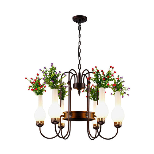 Black Loft Vase Chandelier with Opal Glass Pendants, 6-Light Fixture, and Artificial Plant