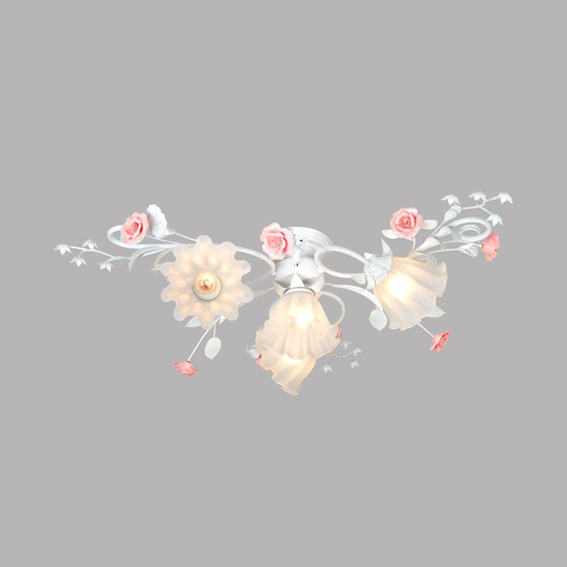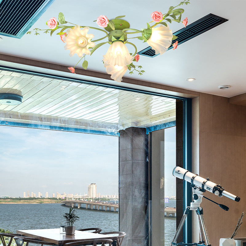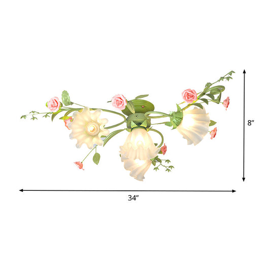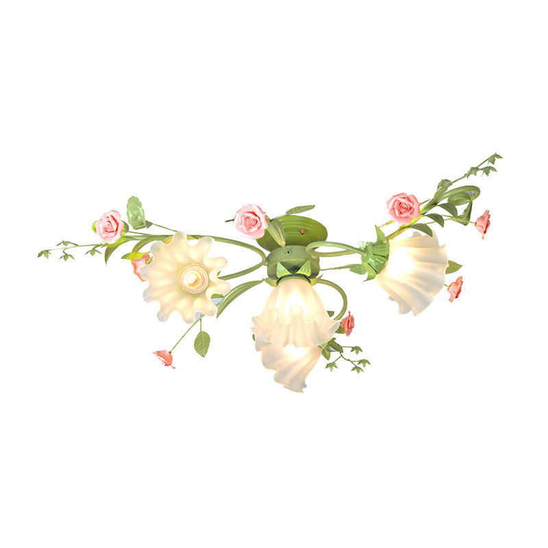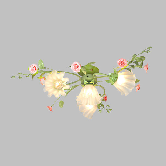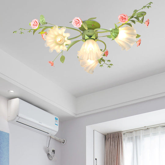 Metal White/Green Ceiling Fixture - Scalloped Design - 4 Bulbs - Pastoral Flower Semi Flush Light for Bedroom