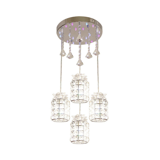 Modern Crystal Cylinder Suspension Lamp - 4-Light Dining Room Pendant Light Chrome Finish