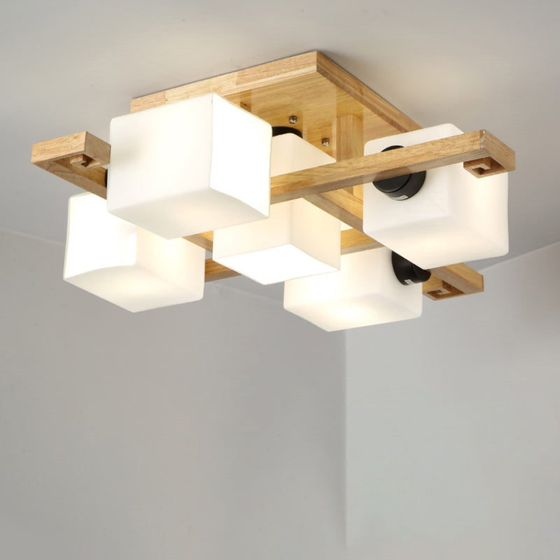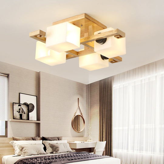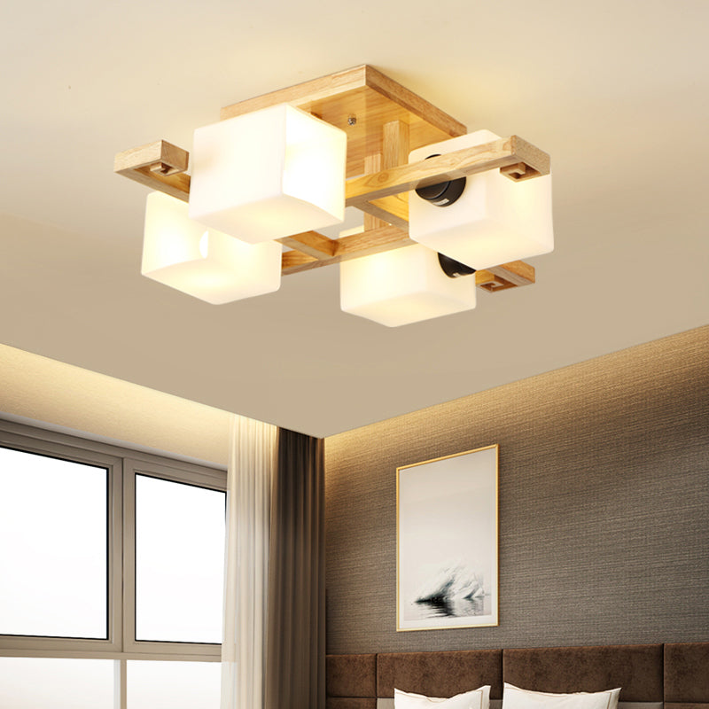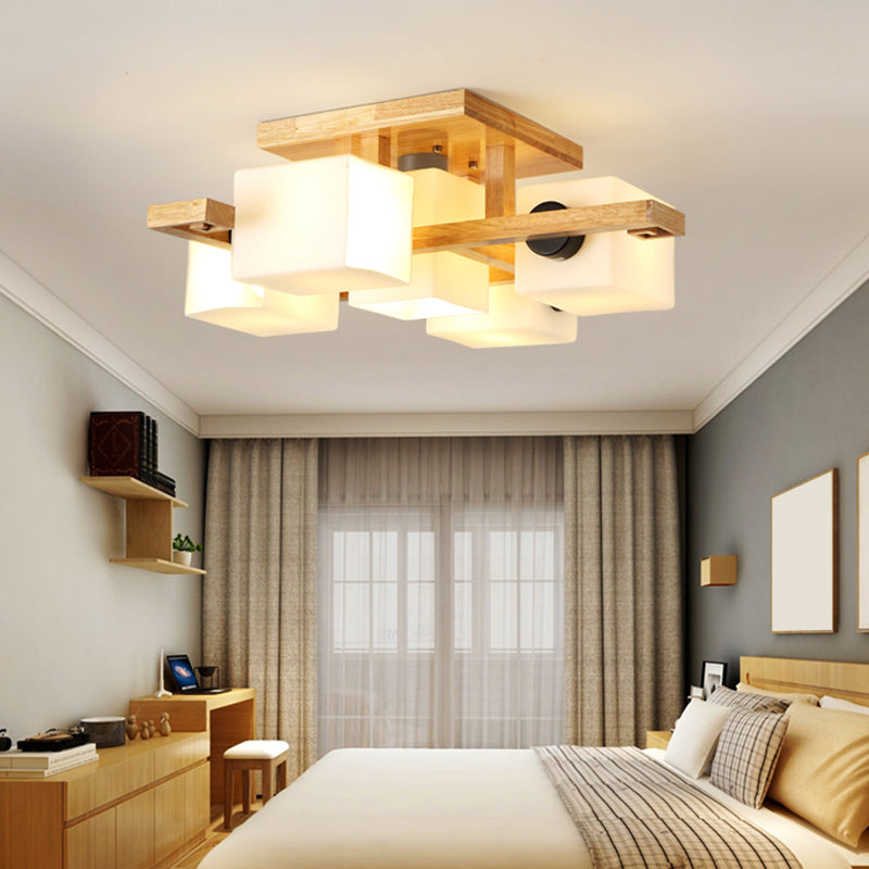 Nordic Style Flush Mount Chandelier with White Glass and Wood Canopy for Living Room Lighting