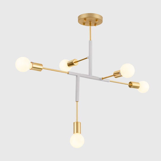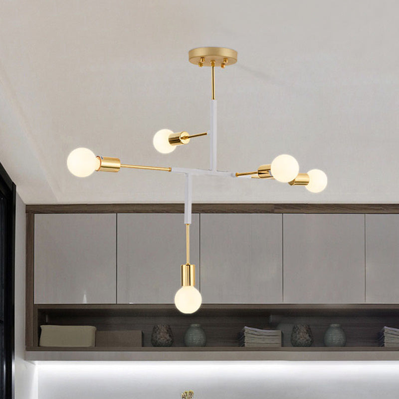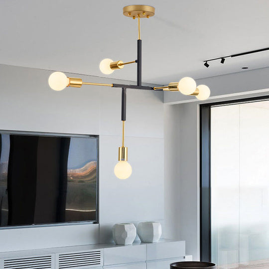 This product is a postmodern metal ceiling light fixture that comes in black/white and gold. It is a vertical exposed light with 5 heads, and is a semi flush mount chandelier. The light bulb base is E26/E27, and the light type can be LED, incandescent, or fluorescent. The voltage is 220V-240V 110V-120V.