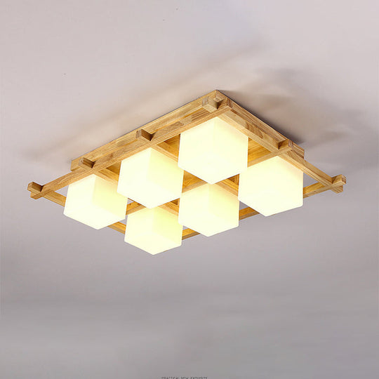 Modern Wood Grid Semi Flush Mount Ceiling Light With 4/6/9 Milk Glass Heads In Beige 6 /