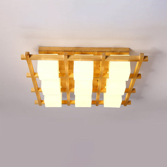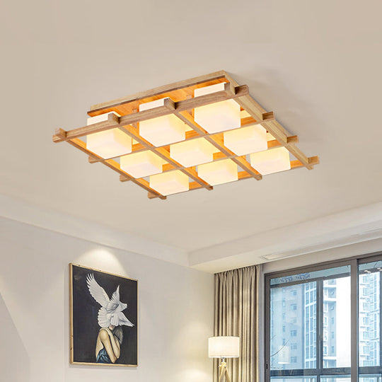 Modern Wood Grid Semi Flush Mount Ceiling Light With 4/6/9 Milk Glass Heads In Beige 9 /