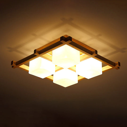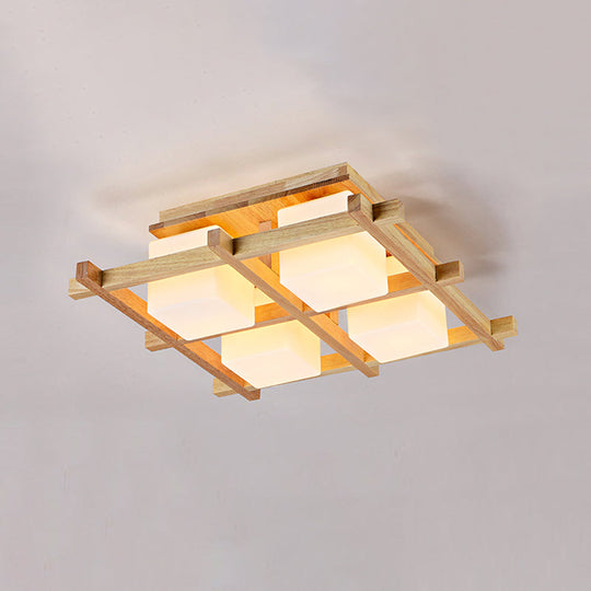 Modern Wood Grid Semi Flush Mount Ceiling Light With 4/6/9 Milk Glass Heads In Beige 4 /