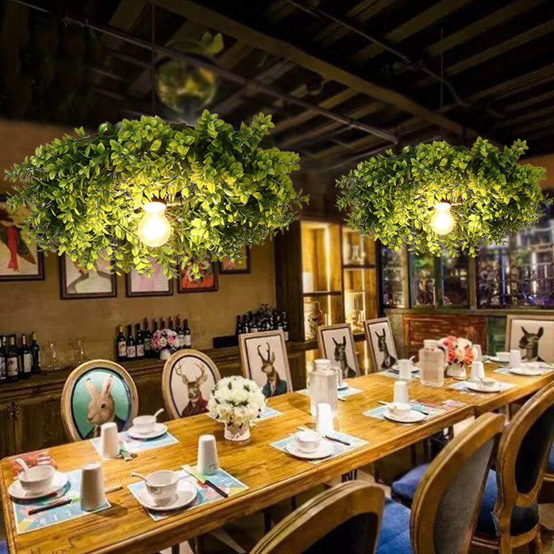 Retro Metal Ceiling Light with Exposed Bulb and Plant Decor - Black Finish