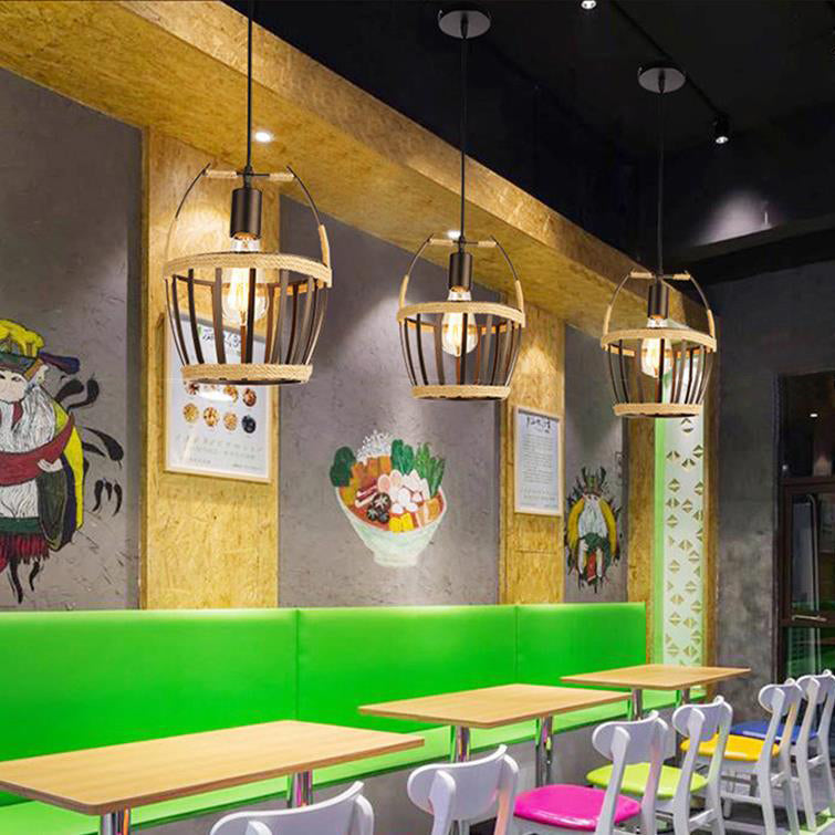Metal Bucket Cage Pendant Ceiling Light With Rope Detail - Country Style In Black For Restaurants
