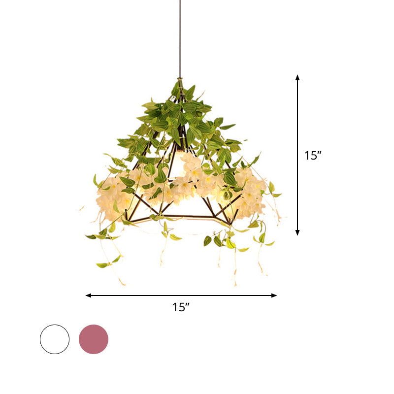 Industrial Iron Diamond Cage Drop Pendant With Cherry Blossom Decor - White/Pink 10/15/18 Wide