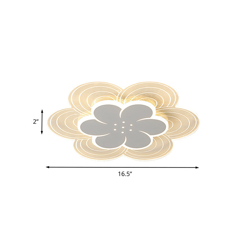 The Ultrathin 2-Tier Petal Acrylic Flushmount Minimalist White LED Ceiling Flush Mount Light for Bedroom is a 16.5-inch-wide by 2-inch-tall ceiling light fixture that comes with a built-in LED light bulb and is available in white. This flushmount light is made from acrylic and has a kids' style, making it perfect for a bedroom. It also has a warm color temperature and is available in 220-240V and 110-120V versions.