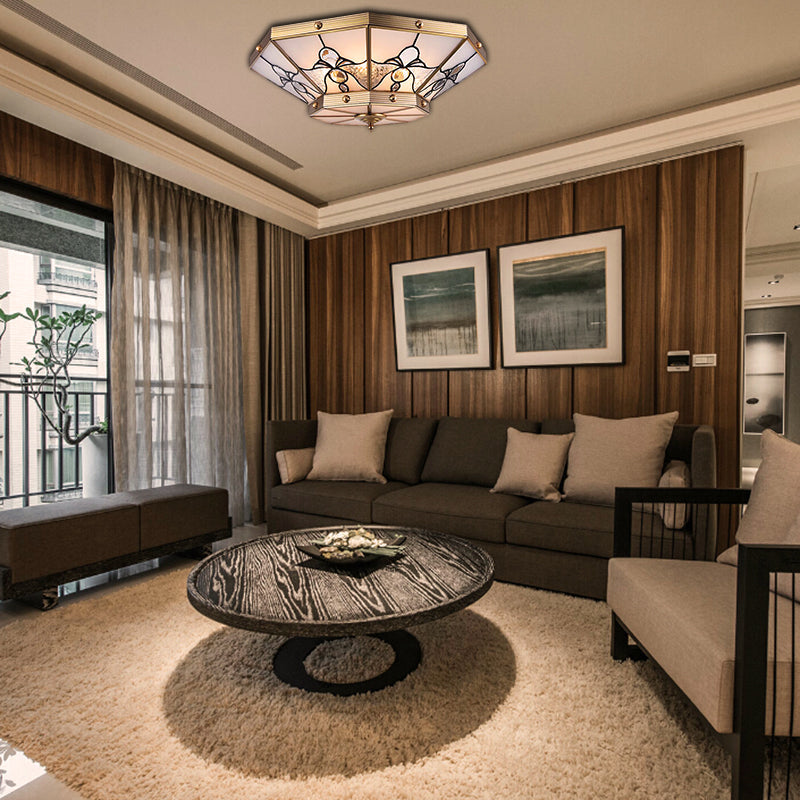 The dimensions of this product are 16"/19.5" W x 8" H x 6" D. It is made of glass and brass, and available in gold. It takes four E26/E27 light bulbs, which are not included. The style is colonial, and the voltage range is 220V-240V or 110V-120V. This product is a flushmount fixture.
